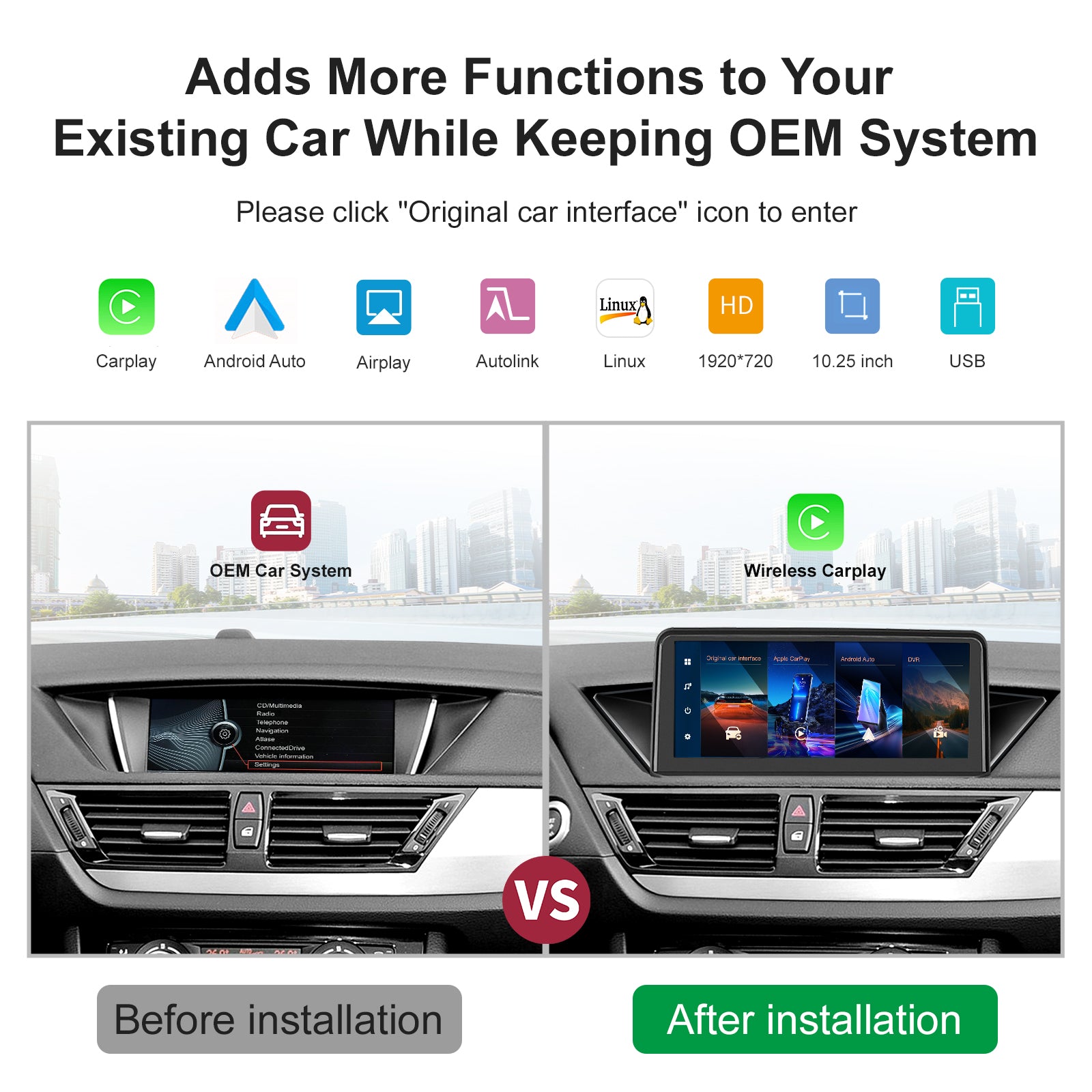 - Compared to the original car, our screen resolution is 1920*720, and the display is higher definition.